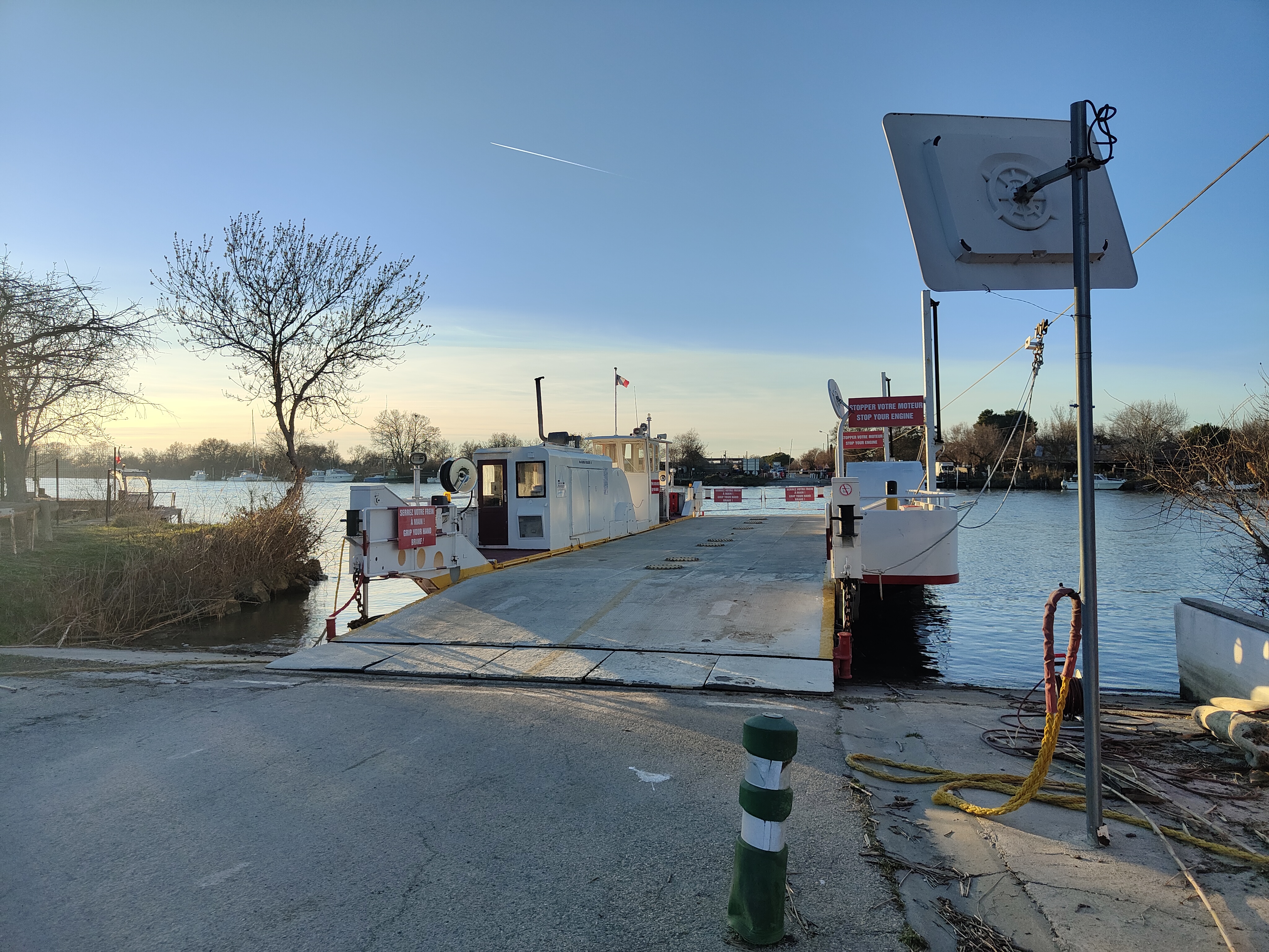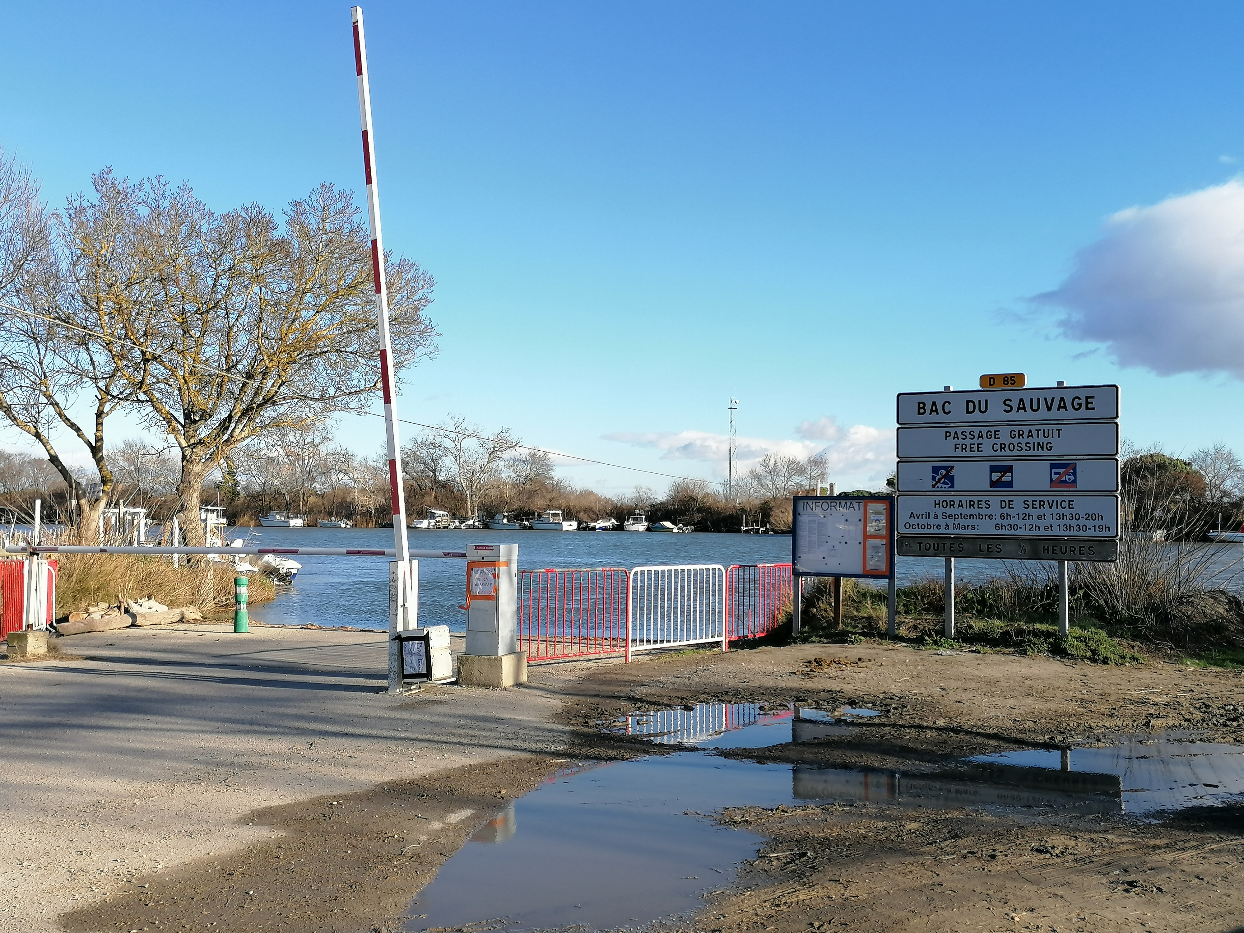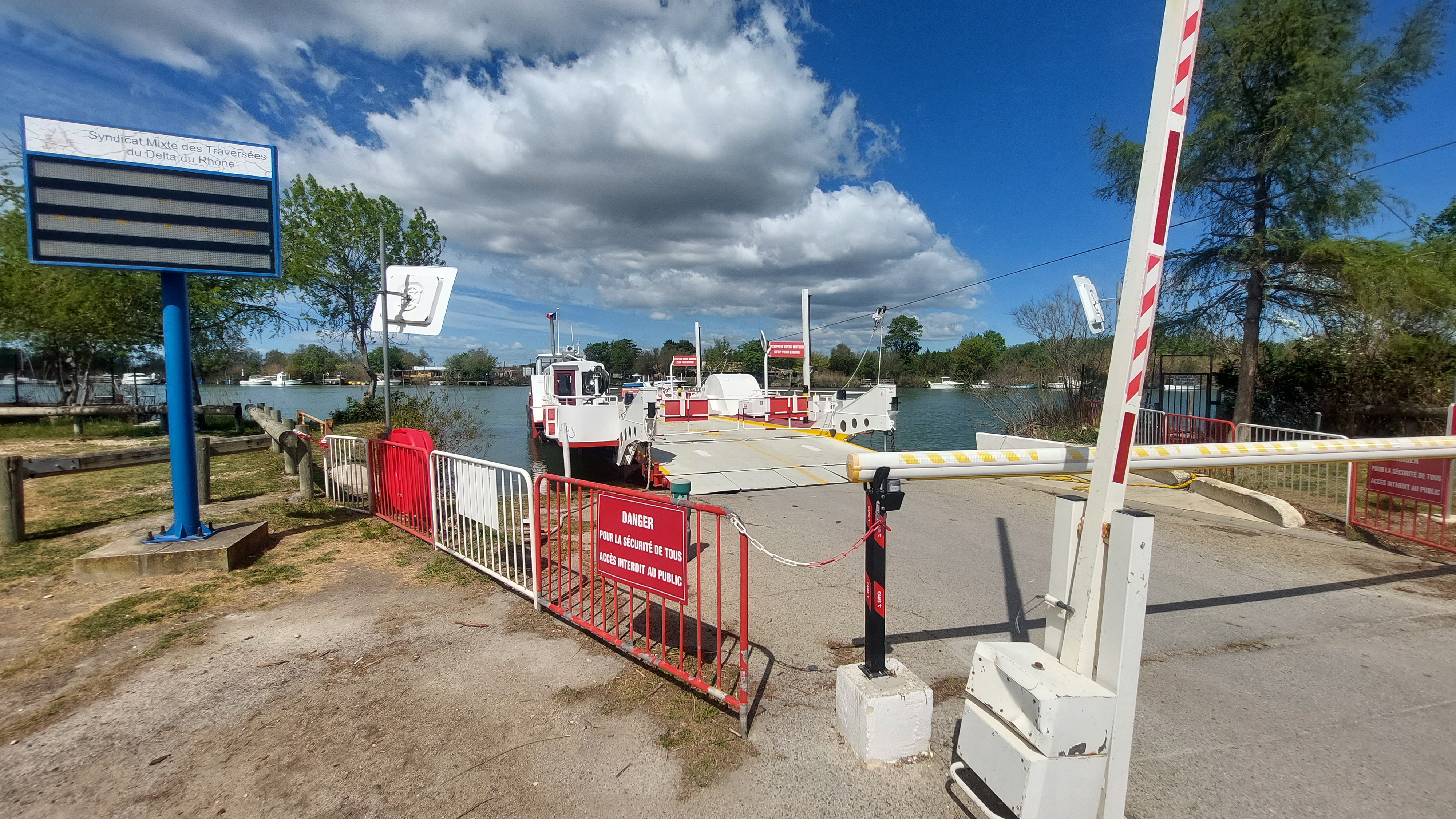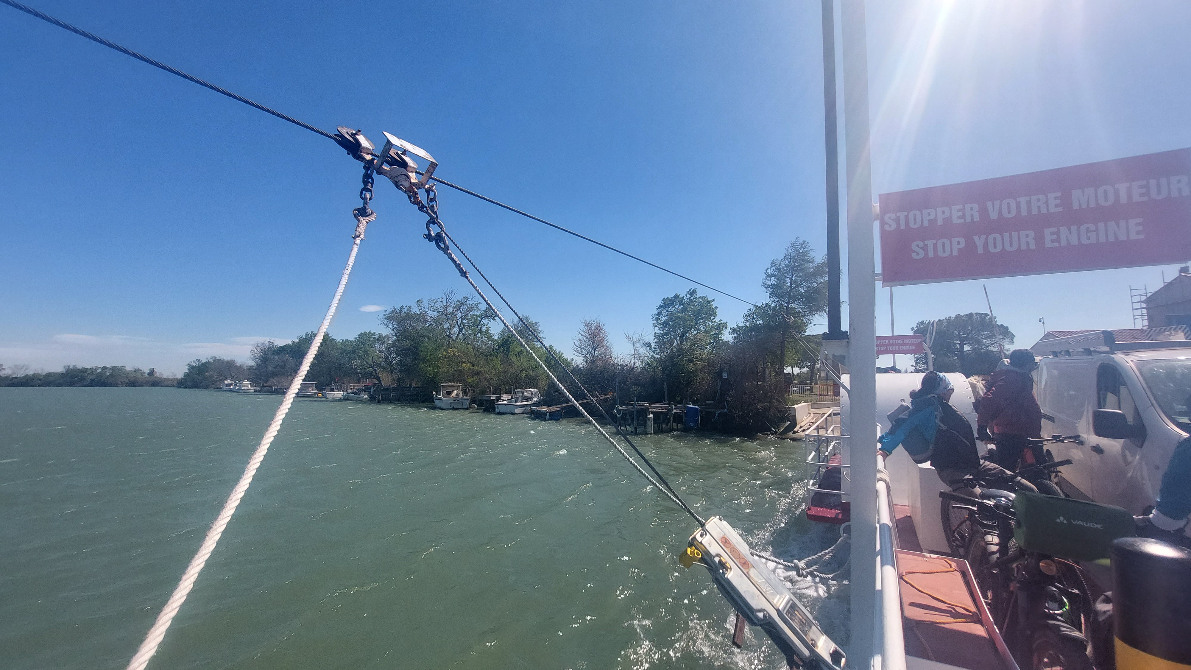 Bac pour traversée du petit Rhône, horaires à respecter (Fermé de 12 à 13h30). Sympa et pratique !