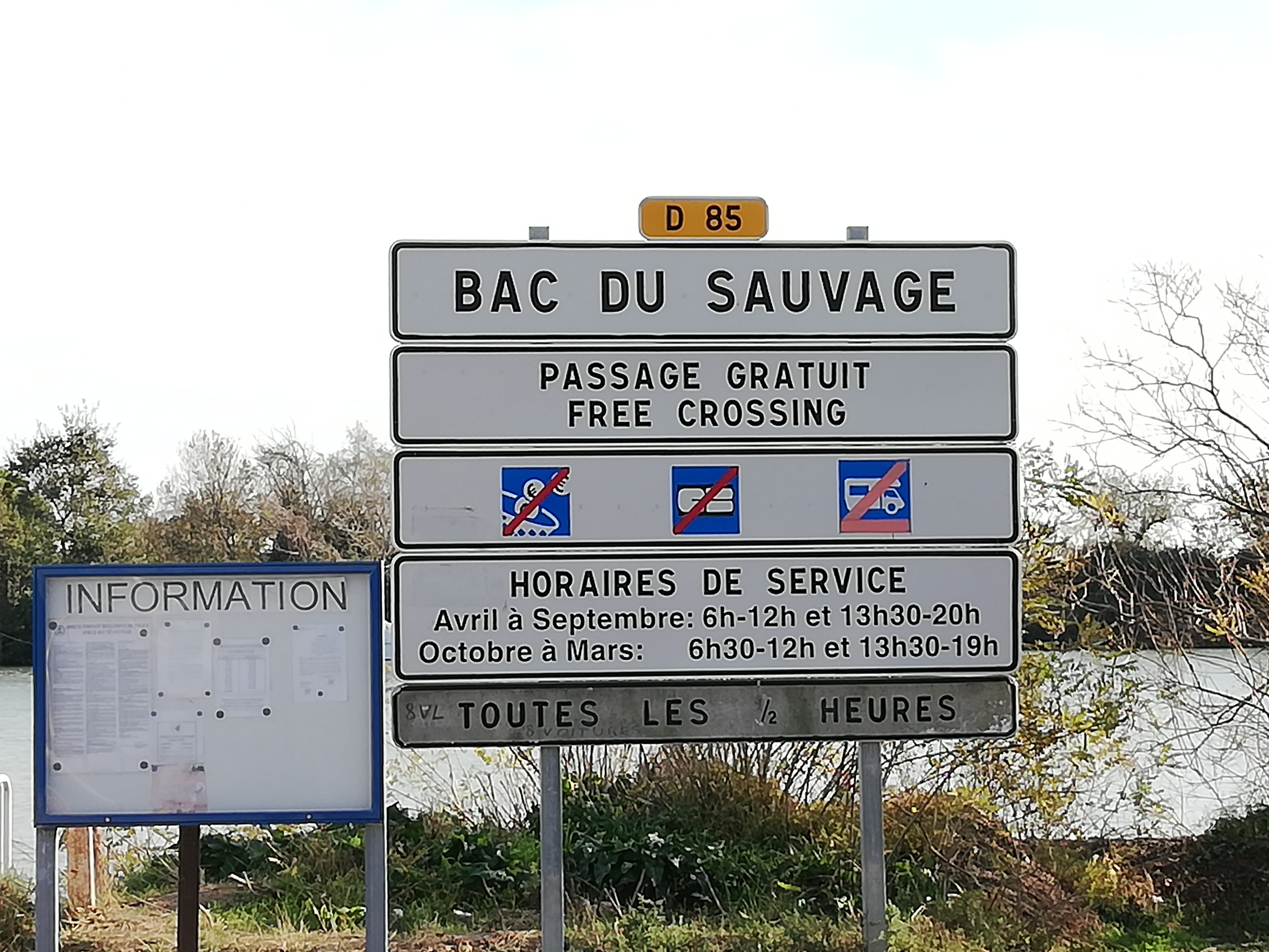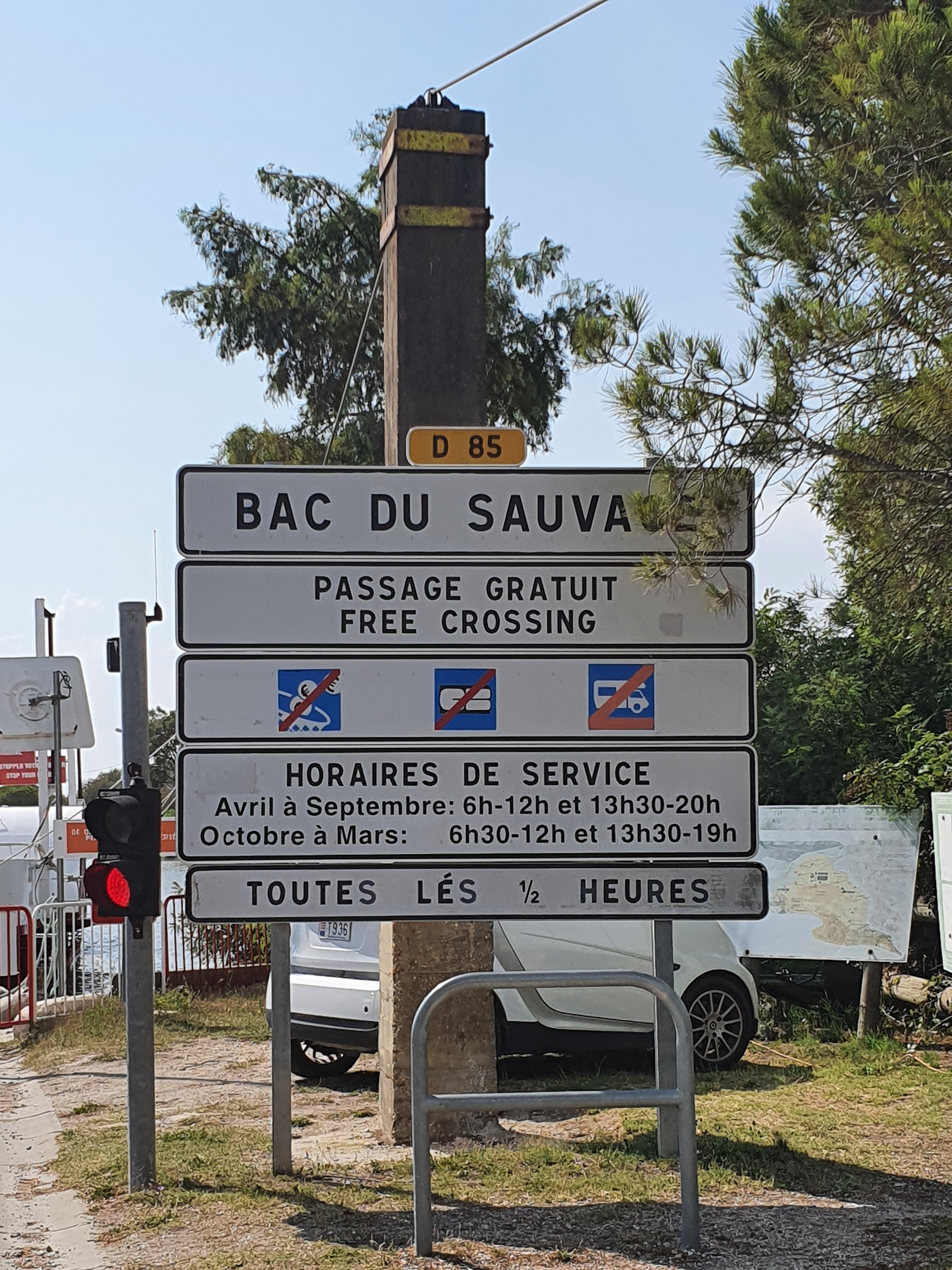 Ouvert toute l'année. Gratuit. Capacité du bac : 8 voitures. Fermé entre 12h et 13h30. Dommage qu'il faille attendre 30mn, pour un passage qui se fait à peine en deux minutes. Traversée effectuée hors-saison (donc sans attendre le prochain passage), je n'ose imaginer en période estivale 🤨