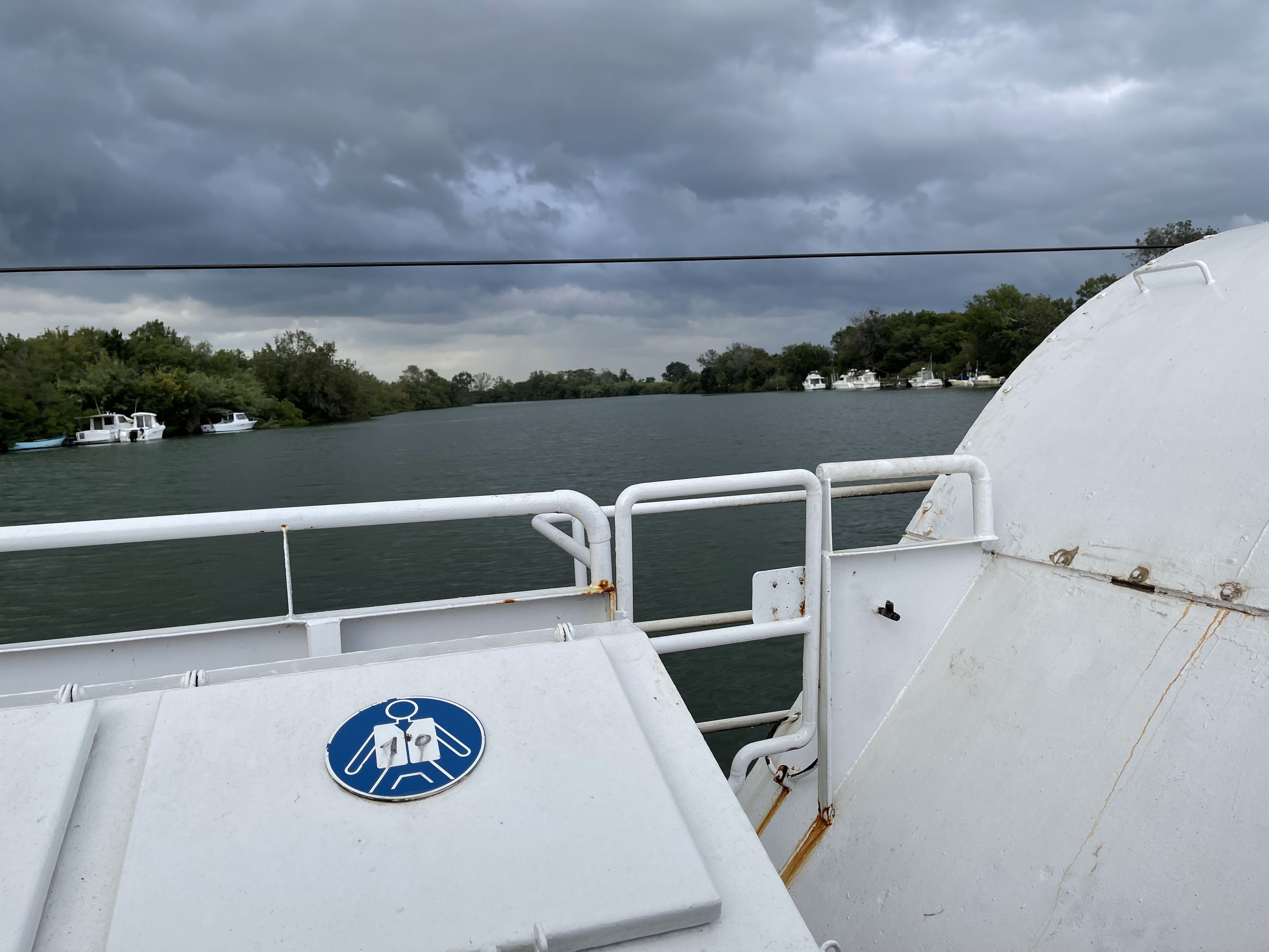 Endroit incongru! On a pris cette route par hasard et on tombe sur ce bac! Le temps s'est arrêté (avec la pause déjeuner!) et il a fallu attendre 1 heure...mais bon, ça fait du bien, c'est les vacances et il faut se détendre. On dirait le Sud, mais plus en mode Louisiane qu'Italie... A voir, assurément.