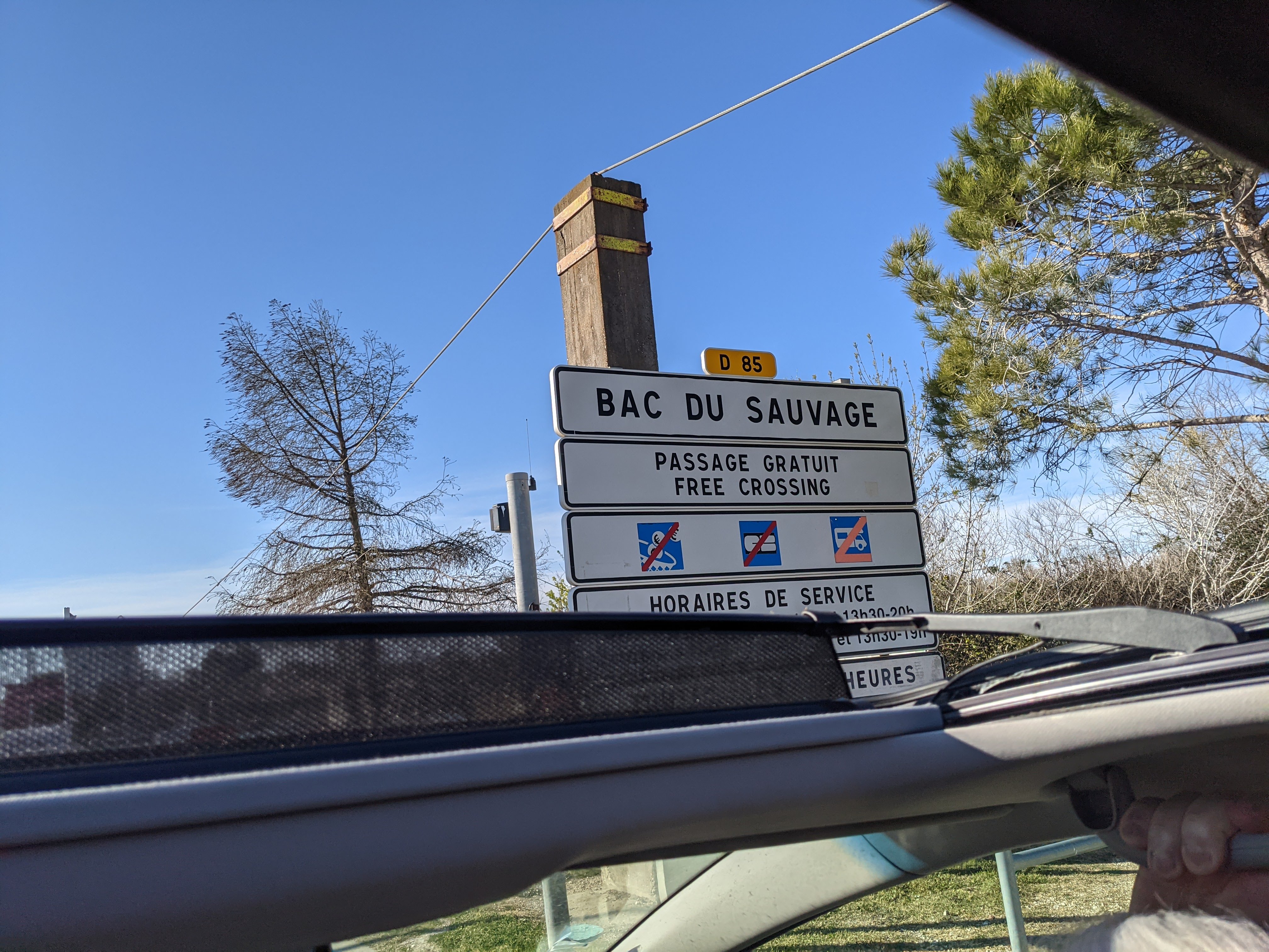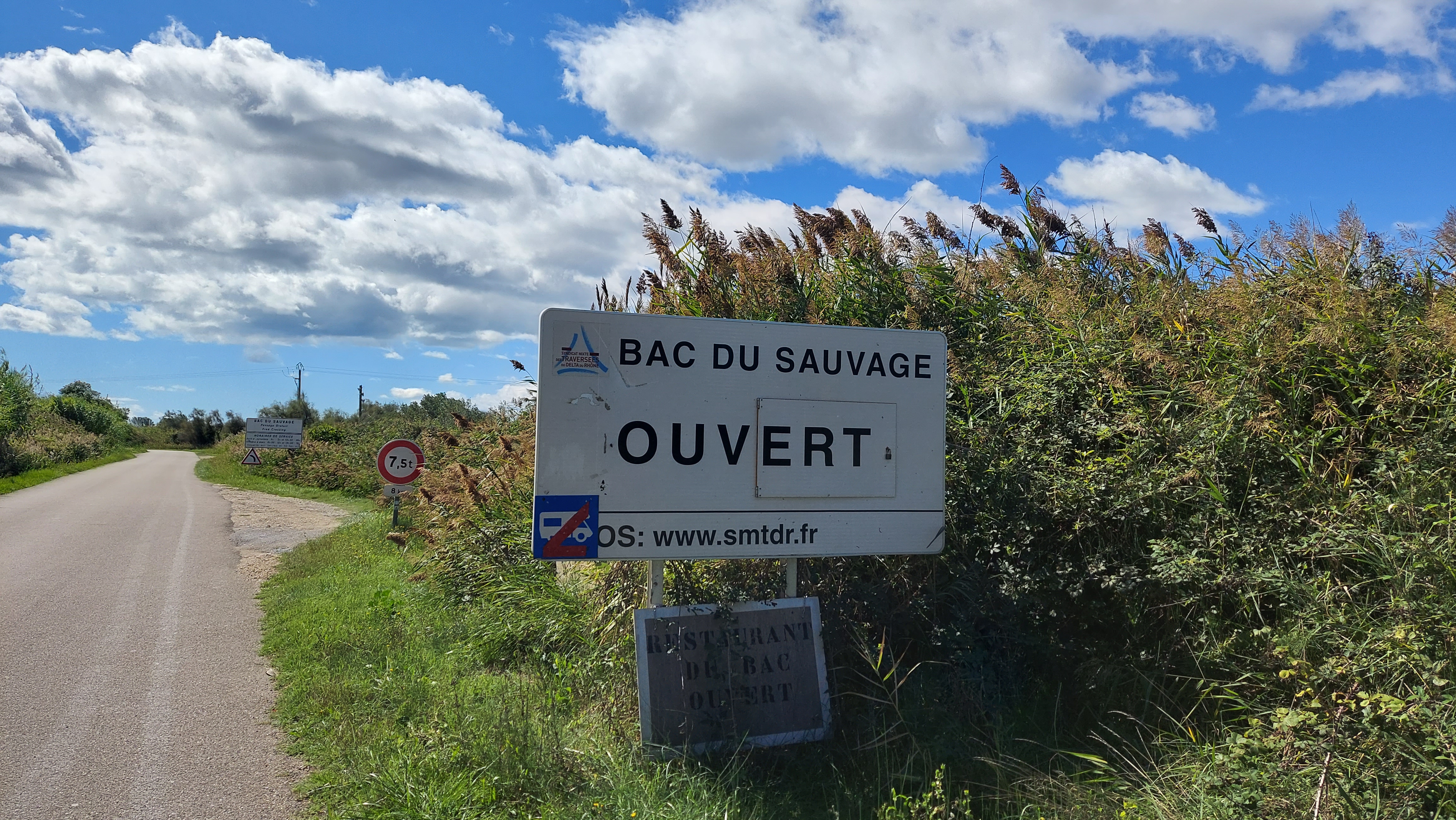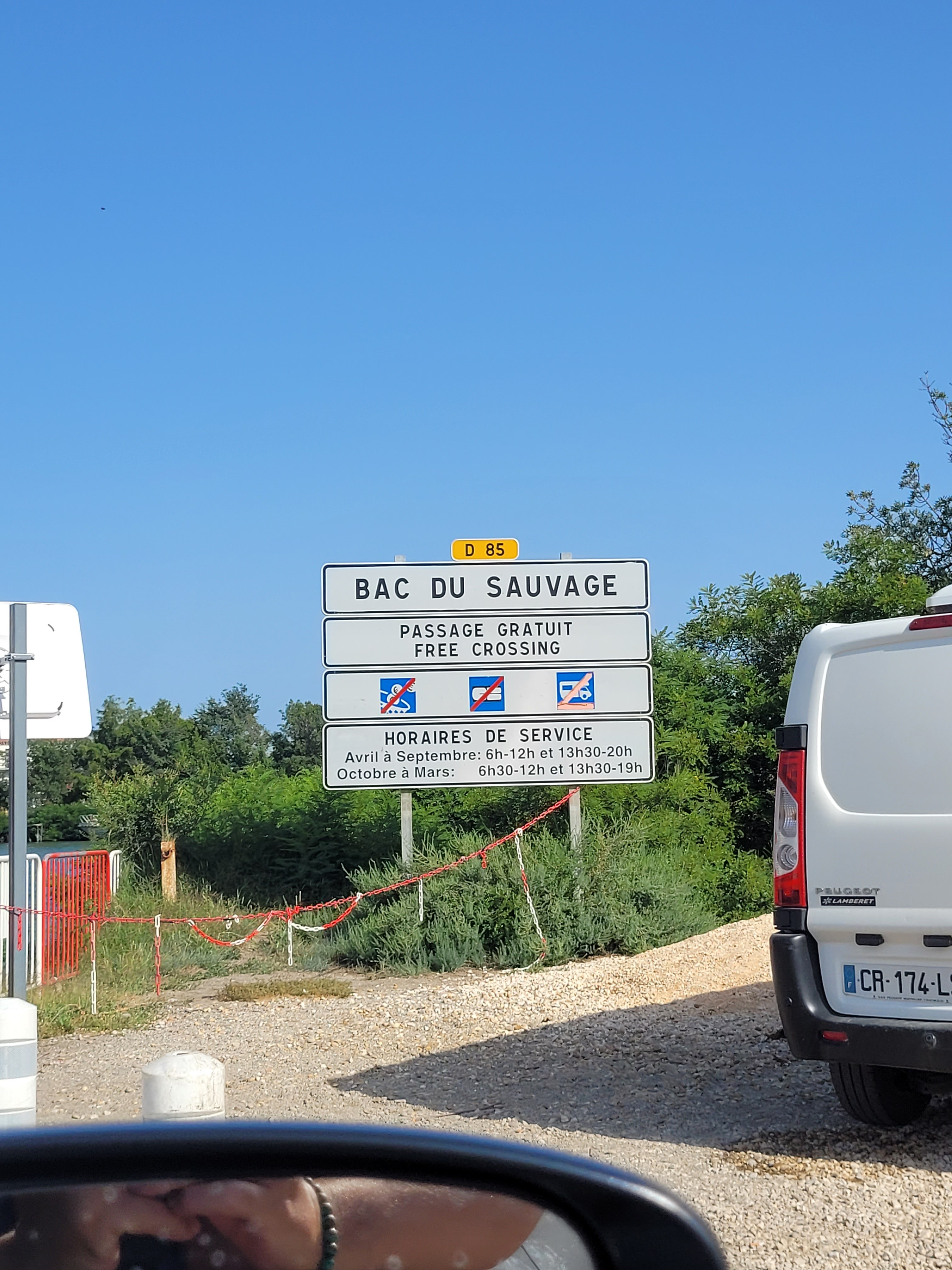 Passage sur le petit rhone gratuit.... 8 voitures max. A tester pendant ces vacances. Belle expérience quand on a le temps de visiter la camargue. Le restaurant à l air terrible mais pas pu tester....