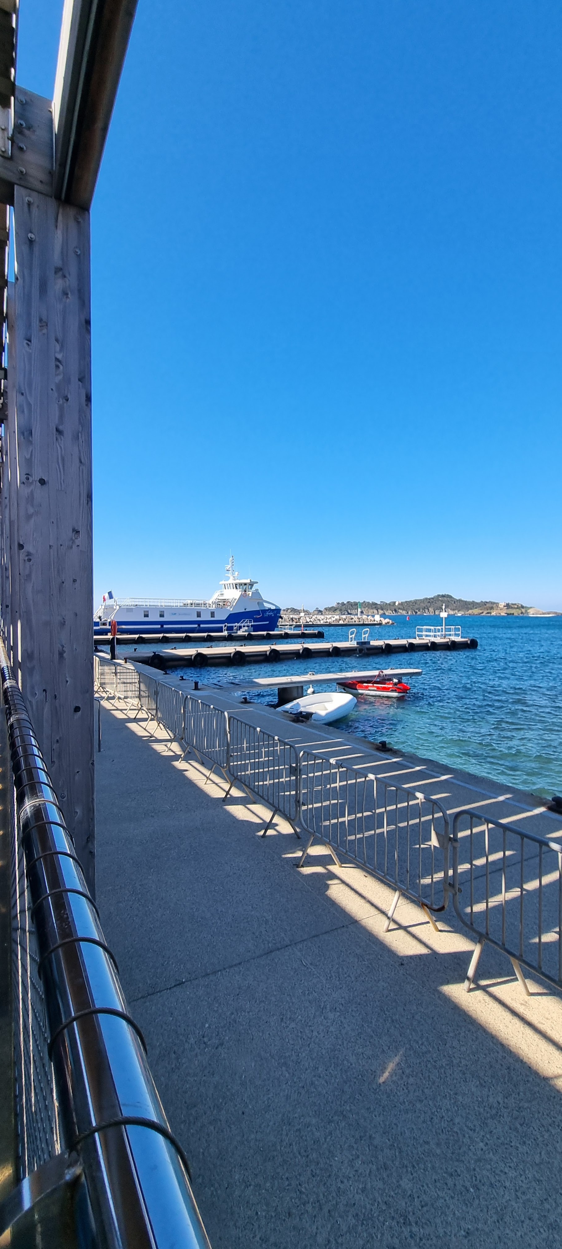 Petit port avec embarquadaire pour l île de porquerolles. Face à une petite forteresse bien entretenue. Une café restaurant pour patienter en regardant la méditerranée. Une image immuable.